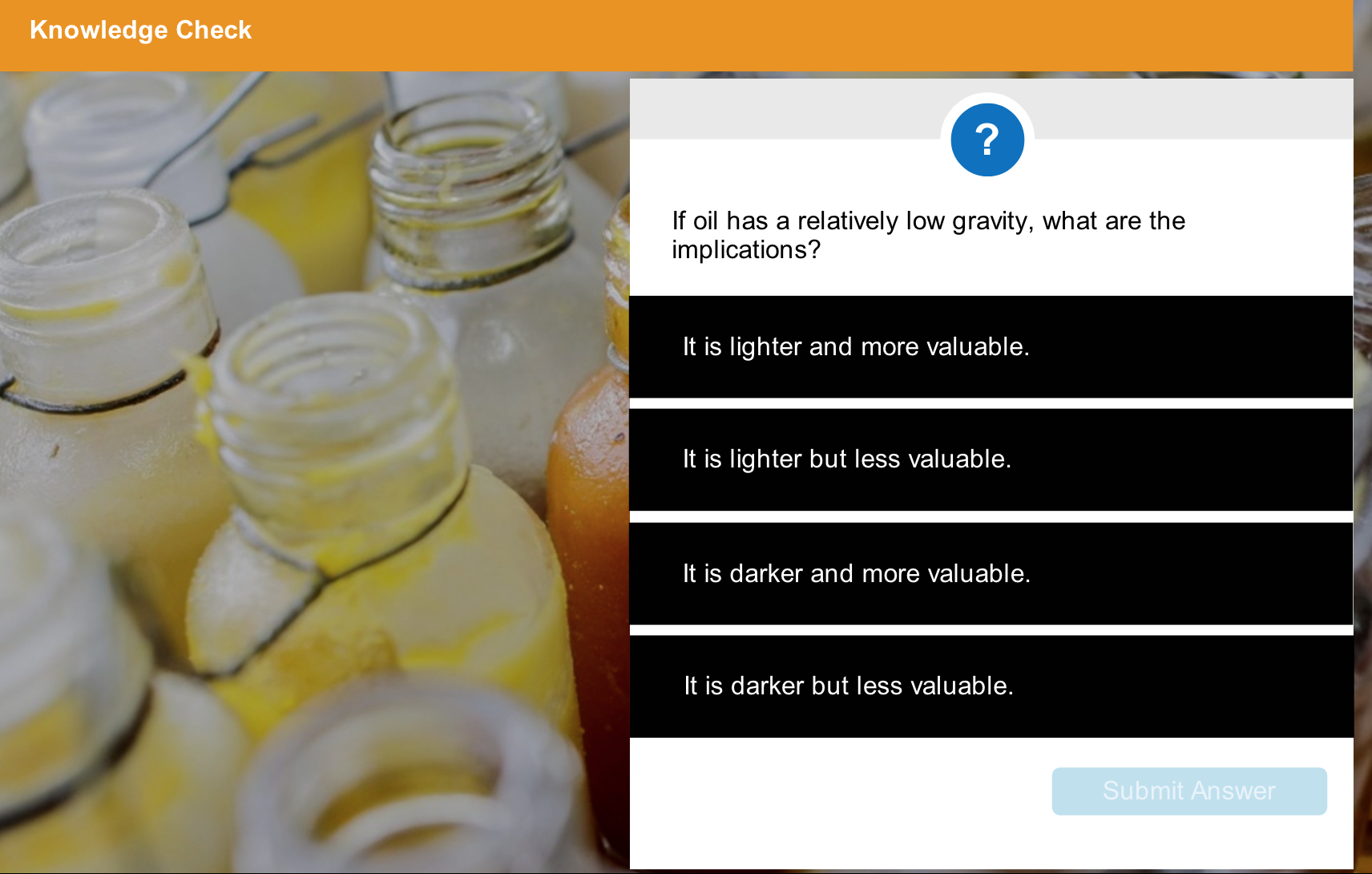 The highest gravity oil to be treated is 41API gravity oil in the Devonian sandstone in Alberta Canada. It is darker but less valuable. Because crude oil has a high proportion of light hydrocarbon fractions it has a high American Petroleum Institute API gravity which means it islighter than some other types of oils.